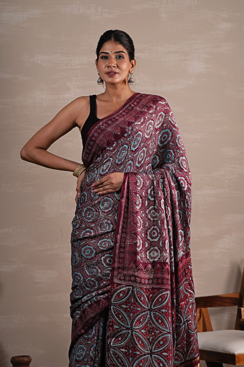 Experience the luxurious comfort and exclusive design of our Carmine Cascade saree. Hand block printed with vibrant naphthol dyes and traditional Bagru prints, this maroon saree will elevate your style and leave you feeling confident and elegant. Made with soft and lightweight modal tissue, it's perfect for any occasion.