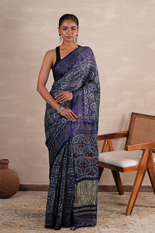 Introducing our Celestial Cascade Hand Block Printed Modal Tissue Saree! Adorned with intricate naphthol dyes and mesmerizing Bagru prints, this blue saree exudes elegance and grace. Experience the magic of Bagru technique and stand out in any occasion. Feel like a celestial goddess in this divine saree.