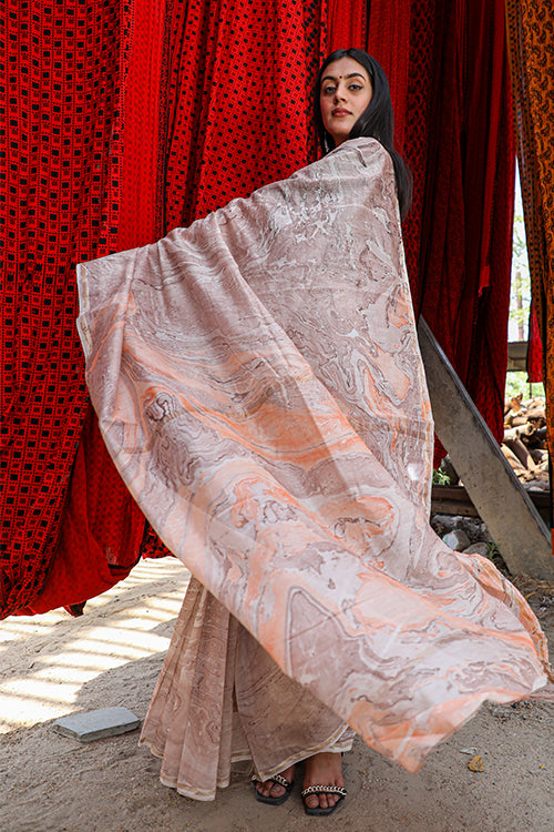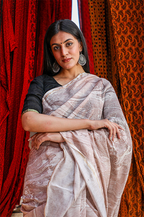 The cloud is grey within itself, yet the brilliant hues of the rainbow can never come to be without it. Who could belive looking as the greying sky laden with dark clouds that they had drunk up a rainbow within? This Chanderi silk is crafted with hand marble printing. It’s a Handprinted Chaneri Silk Saree which is a Silk by Cotton fabric. It's a 5.5 mtr saree drape with exclusive 80 cm blouse piece to go with. Recommended separate wash in cold water with mild detergent only or dry-clean & there are chances of color bleeding of Indigo which is a sign of the genuineness of prints and dying. Blouse wore by model is not part of saree, blouse with saree could be different. Returns will only be considered in case of any defect in saree. There could be minor color variation from image shown here as it depends on screen bightness of device and photography.