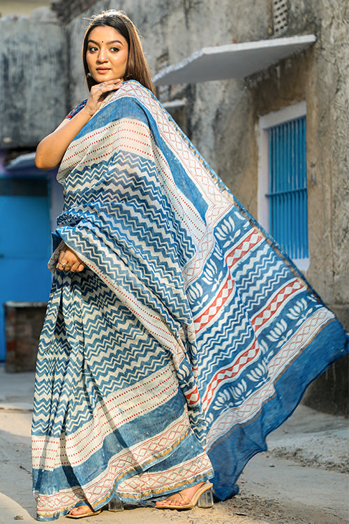 The sky was an unusual shade that evening. As if the sun just didn't want to end the day. Stuck in this dilemma, the sky remained lit, light and breezy while the sun became a red line upon a white horizon. Indigo blue- a shade lighter than the hue expected by you. This chanderi silk saree is crafted with Dabu Handblock Indigo printing. It’s a Handprinted Chanderi Silk Saree which is silk by cotton fabric. It’s a 5.5 mtr saree drape with exclusive 80 cm blouse piece to go with. Recommended separate wash in cold water with mild detergent only or dry-clean & there are chances of color bleeding of Indigo which is a sign of the genuineness of prints and dying. Blouse wore by model is not part of saree, blouse with saree could be different. Returns will only be considered in case of any defect in saree. There could be minor color variation from image shown here as it depends on screen bightness of device and photography.