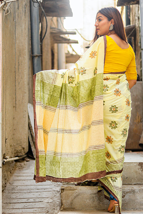 Kids loved climbing up the branches on the mango tree. In the season of blossoms to sleep in the fragrant cool air, in summer afternoons savouring the sour little fruits. Till one of them spotted the vanishing white saree. Chinnamma has her mangoes ripening safely now. This mul cotton saree is crafted with Pigment Handblock Sanganeri prints. It’s a Handprinted Mul Cotton Saree which is a comfortable & breathable cotton fabric a perfect fit for Indian summer daily wear. It’s a 5.5 mtr saree drape with an exclusive 80 cm blouse piece to go with. Recommended separate wash in cold water with mild detergent only or dry-clean & there are chances of color bleeding of Indigo which is a sign of the genuineness of prints and dying. Blouse wore by model is not part of saree, blouse with saree could be different. Returns will only be considered in case of any defect in saree. There could be minor color variation from image shown here as it depends on screen bightness of device and photography.