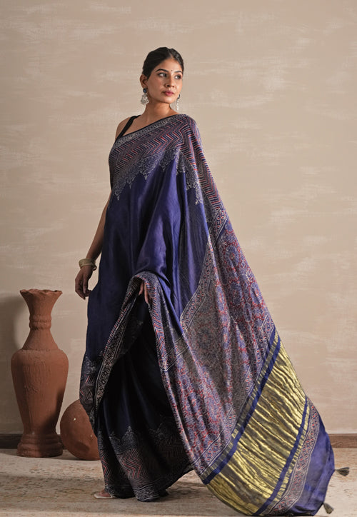 Indulge in the ethereal beauty of our Midnight Serenade Hand Block Printed Saree. Its intricate design, vibrant naphthol dyes, and traditional Bagru printing will elevate your style. The rich navy blue hue adds extra elegance to this modal tissue saree. Make heads turn at any event with this stunning piece! Pattern : Bagru Blockprint. The beautiful design is skillfully created using time-honored hand block printing techniques resulting in a unique, subtly textured design with exquisite attention to detail. Fabric : Modal Satin. Modal fabric is a bio-based fabric that is made from spinning beech tree cellulose. Modal is generally considered a more eco-friendly alternative to cotton because beech trees don’t require much water to grow and therefore the production process uses about 10-20 times less water. Modal Satin has a lustrous soft feel and a lovely drape for a gorgeous flowing look. This fabric is woven using a technique in which at least four weft yarns are woven over a single warp yarn at a time. After being woven together these yarns can be used to create a fabric that is strong and durable. Length : 5.5 Mtr Saree with exclusive 0.8 Mtr Blouse Note: Blouse worn by model in pictures is for photoshoot only. Blouse piece provided with Saree is different than this and its complimenting the Saree prints.