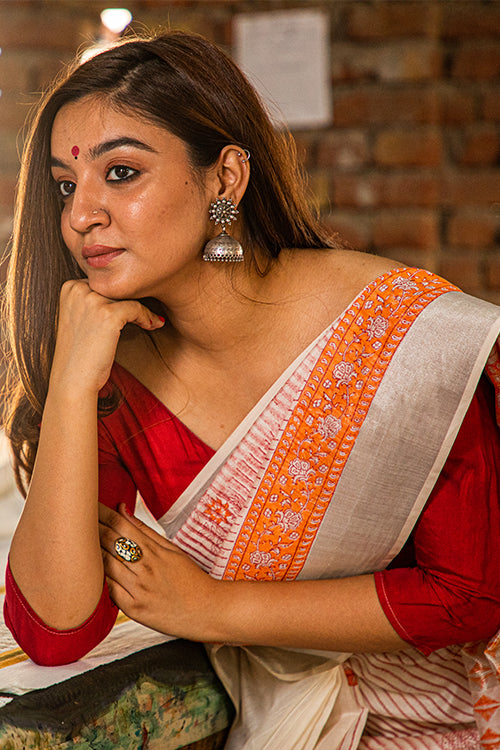 The bright colours of handblock discharge prints are such, you definitely would love to pick more than one. Shop for that perfect shade or pick your all-time favourite. It’s a Maheshwari Silk 5.5 mtr saree drape with exclusive 80 cm blouse piece to go with.