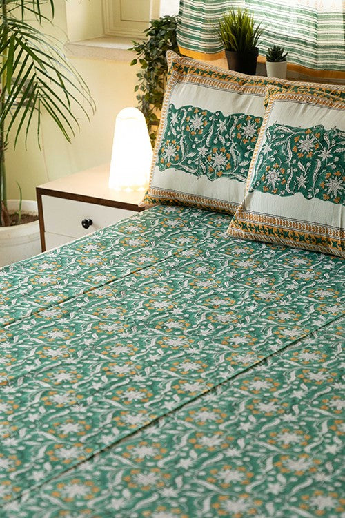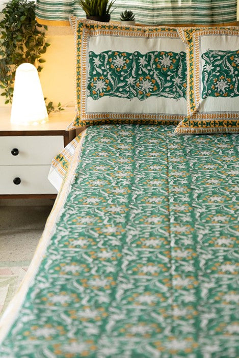 Handblock printed king size cotton bedsheets with two pillow cover to enhance grace & luxury of your bedroom. This handblock printed bedsheet is handcrafted by artisan printers of Sanganer Jaipur, who are one among the torchbearers of Indian Craft. Handblock printing is a centuries-old art form that utilizes a hand-carved wood block, dipped in dye and stamped by hand onto fabric. This set includes One Bedsheet Size: 90*108 Inches, Two Pillow Covers Size : 40*70 Inches Crafted with love by Sootisyahi