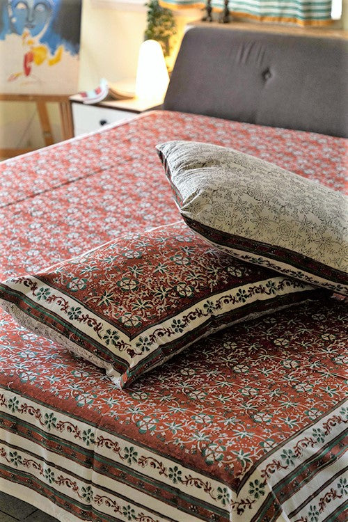 Handblock printed king size cotton bedsheets with two pillow cover to enhance grace & luxury of your bedroom. This handblock printed bedsheet is handcrafted by artisan printers of Sanganer Jaipur, who are one among the torchbearers of Indian Craft. Handblock printing is a centuries-old art form that utilizes a hand-carved wood block, dipped in dye and stamped by hand onto fabric. This set includes One Bedsheet Size: 90*108 Inches, Two Pillow Covers Size : 40*70 Inches Crafted with love by Sootisyahi