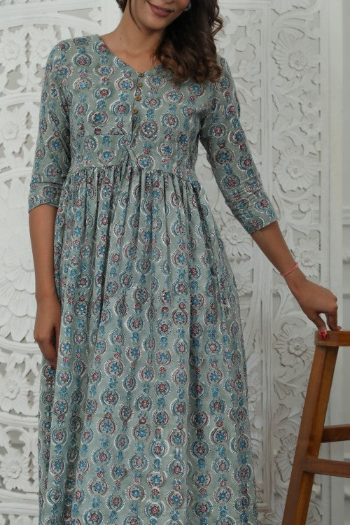 Experience the missing piece in your wardrobe with the floral beauty of Sootisyahi's cotton dress. Meticulously crafted for optimum comfort, this dress features a smart color-blocking design and vibrant floral prints in a multi-coloured combination. Whether you're working or relaxing, choose this breathable dress for a full day of comfort. Complete the look with block heels or flats, a sling bag, and set out to have a wonderful day. Made from azo-free hand-block printed fabrics, this dress reflects our commitment to ecological quality and exudes confidence.
