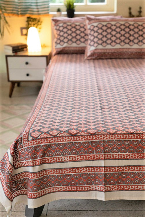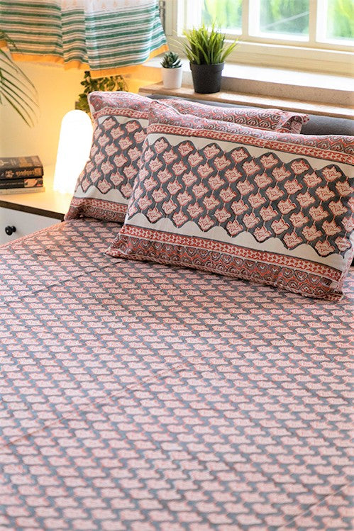 Handblock printed king size cotton bedsheets with two pillow cover to enhance grace & luxury of your bedroom. This handblock printed bedsheet is handcrafted by artisan printers of Sanganer Jaipur, who are one among the torchbearers of Indian Craft. Handblock printing is a centuries-old art form that utilizes a hand-carved wood block, dipped in dye and stamped by hand onto fabric. This set includes One Bedsheet Size: 90*108 Inches, Two Pillow Covers Size : 40*70 Inches Crafted with love by Sootisyahi