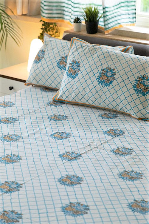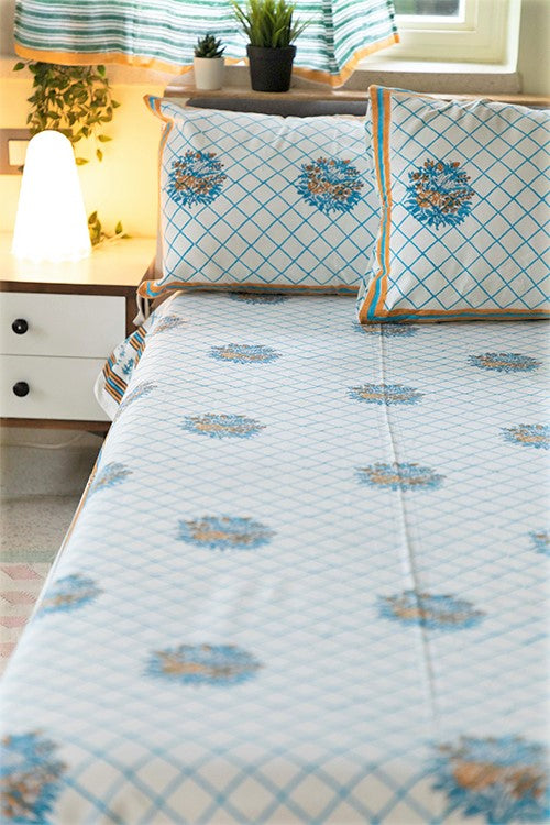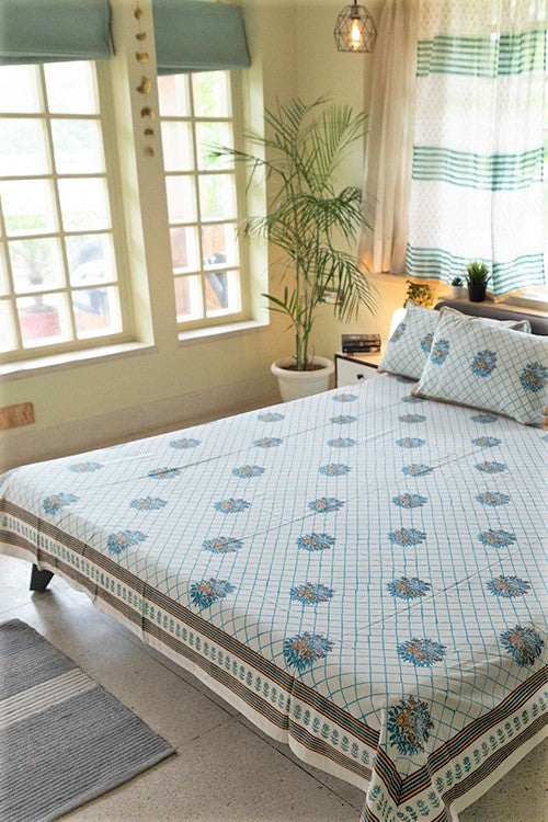 Handblock printed king size cotton bedsheets with two pillow cover to enhance grace & luxury of your bedroom. This handblock printed bedsheet is handcrafted by artisan printers of Sanganer Jaipur, who are one among the torchbearers of Indian Craft. Handblock printing is a centuries-old art form that utilizes a hand-carved wood block, dipped in dye and stamped by hand onto fabric. This set includes One Bedsheet Size: 90*108 Inches, Two Pillow Covers Size : 40*70 Inches Crafted with love by Sootisyahi