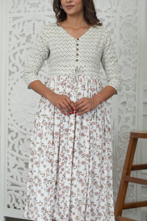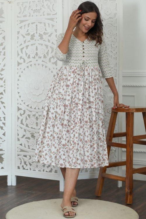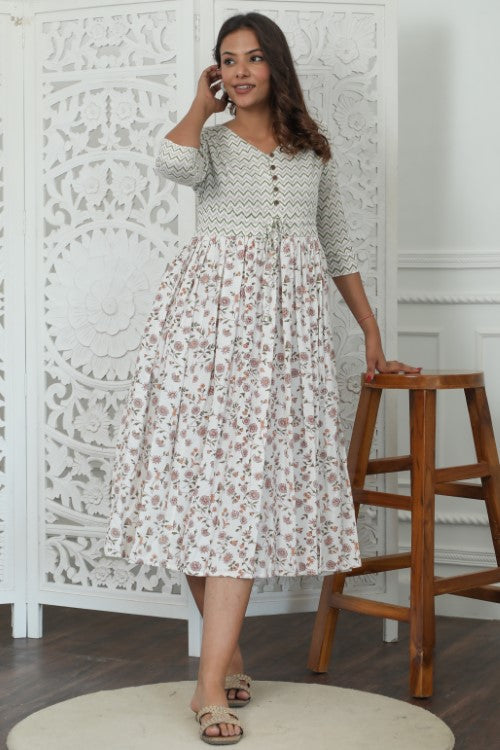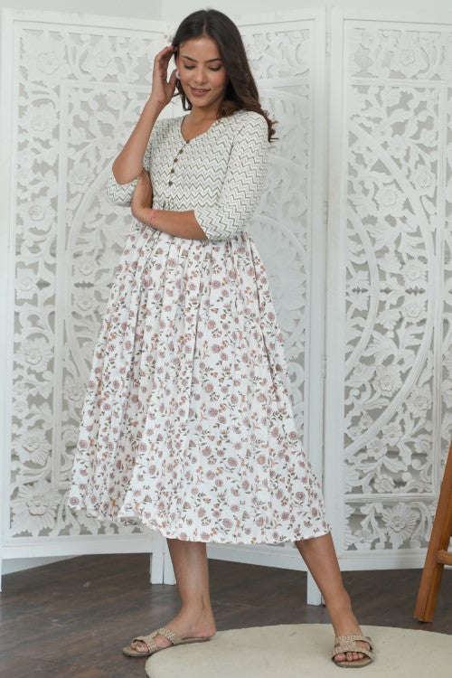 Experience the missing piece in your wardrobe with the floral beauty of Sootisyahi's cotton dress. Meticulously crafted for optimum comfort, this dress features a smart color-blocking design and vibrant floral prints in a multi-coloured combination. Whether you're working or relaxing, choose this breathable dress for a full day of comfort. Complete the look with block heels or flats, a sling bag, and set out to have a wonderful day. Made from azo-free hand-block printed fabrics, this dress reflects our commitment to ecological quality and exudes confidence.