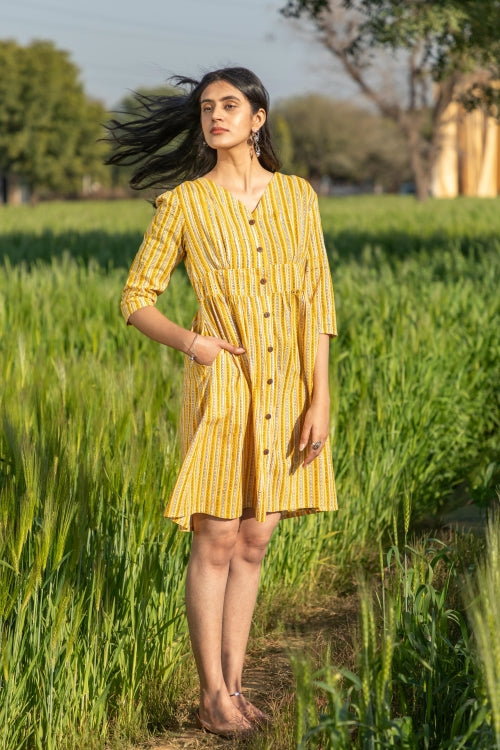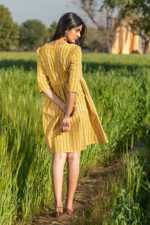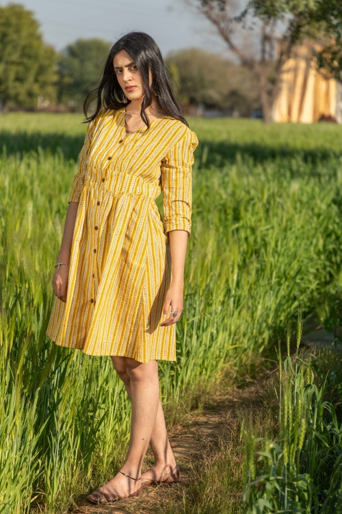 This floral beauty is what you've been missing. Sootisyahi sunny Stripes, dress is crafted with the utmost care in pure cotton fabric, ensuring the best comfort. A smart color-blocking for a smart look, enjoy this combination in stripe prints. Pick this breathable dress for a full day of comfort while working or relaxing. This piece comes with one pocket for your needs. Pair is with block heels or flats, a sling bag, and set out to have a wonderful day. This dress is stitched from azo free handblocked printed fabrics which ensure an confidence and commitment towards the ecological quality of our products.