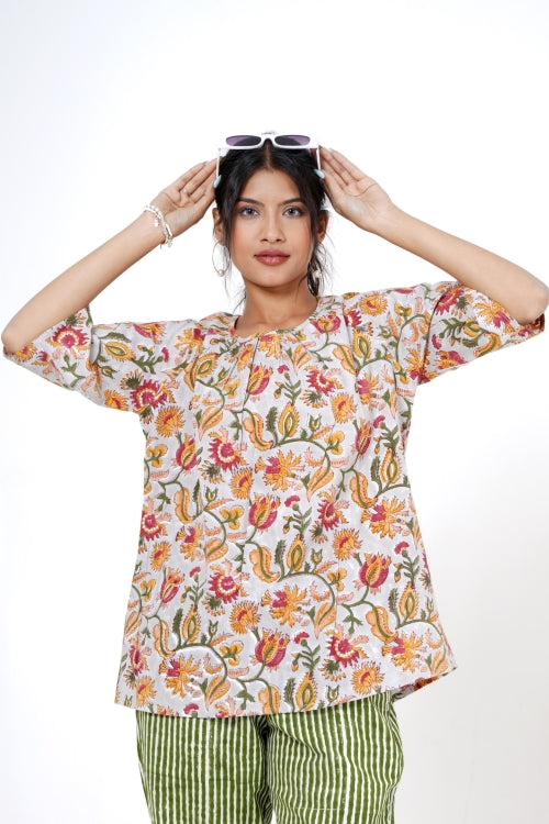 "Step into a world of artisanal elegance with our Hand Block Printed Cotton Top. Meticulously crafted by skilled artisans, each piece exudes the rich heritage of traditional Indian block printing techniques. With its luxurious cotton fabric, elegant elbow-length sleeves, and intricate hand block prints in vibrant hues, this top effortlessly blends timeless charm with contemporary style. Embrace the artistry of craftsmanship and elevate your wardrobe with this exquisite masterpiece, perfect for any occasion."