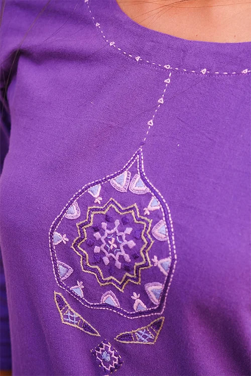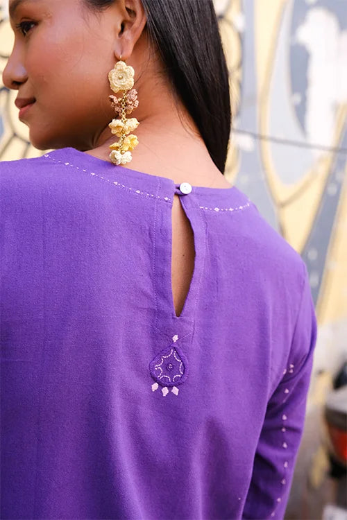 Lush, layered, and just a little indulgent—Fig brings the richness of the fruit to life in deep purple cotton. The Suf embroidery plays with geometric details, echoing the fig’s intricate interior, its soft patterns stitched with precision. The kurta’s relaxed silhouette meets structured craft, making it equal parts rooted and refined. It’s the kind of set that holds its own—whether you wear it with antique silver jewelry for a touch of old-world charm or keep it simple with nude flats and let the embroidery do the talking.