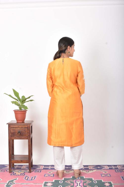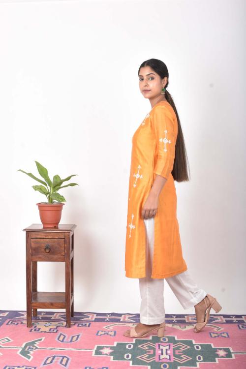 Champa is made out of pure chanderi Fabric in mustard color. The color has been selected to give a contemporary look in the traditional motifs. Embroidery Style used in the Kurti is sindhi Work in the neck and sindhi buttis on front that has been lovingly embroidered with artisans of thar desert. Pairing it with white and shade of white plazzo will give an exemplary look.