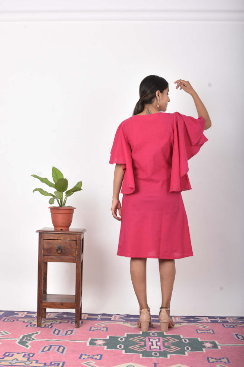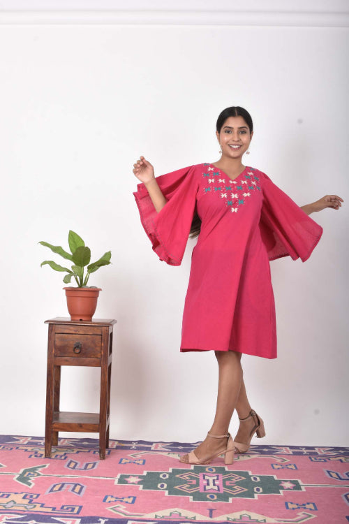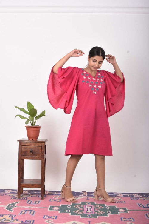 Monarch is a magnificent flowy short dress with a gorgeous modern silhouette and traditional embroidery from the culturally rich land of Rajasthan. The unbound sleeves of the monarch instills it with a soulful essence to the garment. Monarch has been beautified with traditional regional handembriodery of the western Rajasthan. The intricate work provides a bohemian essence to the monarch which is the perfect garment for all the free spirited bohemians out there.