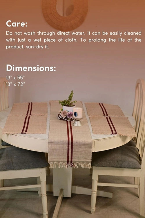 Elevate your dining space with Kadam Haat’s “Vintage Loom” Handcrafted Madurkathi Table Runner. Made from natural Madurkathi reeds and cotton threads, this eco-friendly runner adds warmth and texture to sustainable homes. Handwoven by women artisans in Bengal, each piece reflects timeless Indian craft. Includes one table runner.