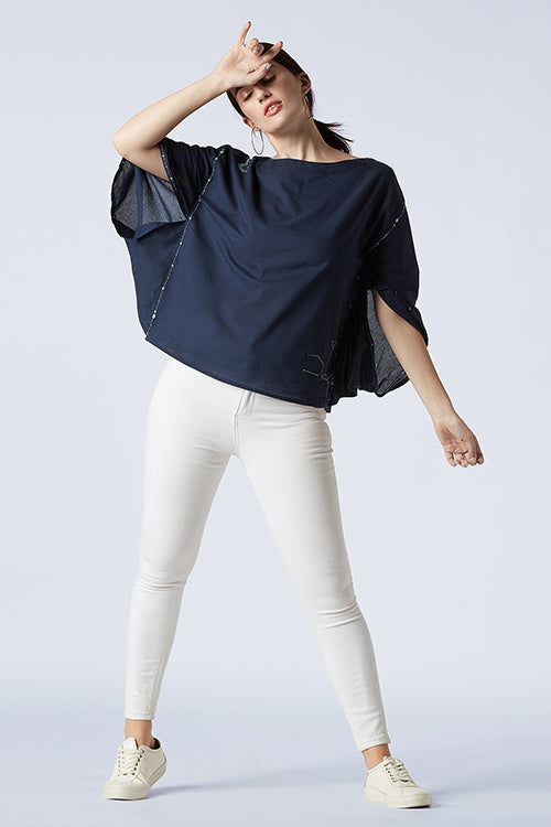 Dance in the desert on your next exotic getaway and the dress fit to be worn in this scene? Our "Sandgrain" Cropped Top, crafted from pure cotton. It exhibits a stitched tapestry of floral and butti printed fabrics, achieved through the patient art of Handblock Printing. The V-neckline, the cropped length, and the puffed look of the sleeves with elastication at the edges- all give you a relaxed yet regal look. The wooden buttons on the front embrace the natural elements. An attachment made of the butti print fabric runs diagonally along the sleeves, giving it that rustic feel. Pair it with our "Lunar Reflection" pants or high-waisted beige pants to let the flowers and buttis sing!