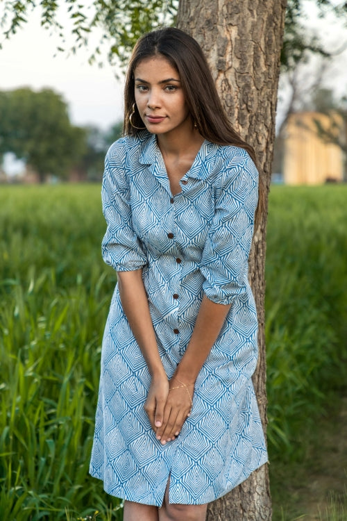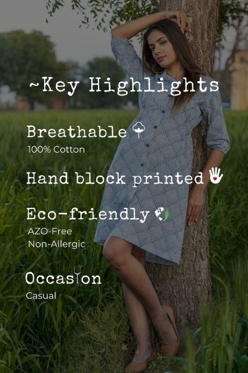 This floral beauty is what you’ve been missing. Sootisyahi’s ‘Blue and Bay’ dress is crafted with the utmost care in pure cotton fabric, ensuring the best comfort. A smart color-blocking for a smart look, enjoy this combination in geometric prints. Pick this breathable dress for a full day of comfort while working or relaxing. This piece comes with one pocket for your needs. Pair is with block heels or flats, a sling bag, and set out to have a wonderful day.This dress is stitched from azo free handblock printed fabrics which ensure an econfidence and commitment towards the ecological quality of our products.