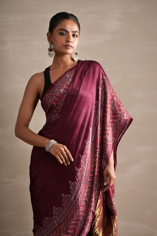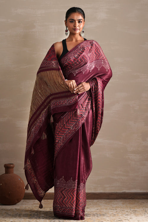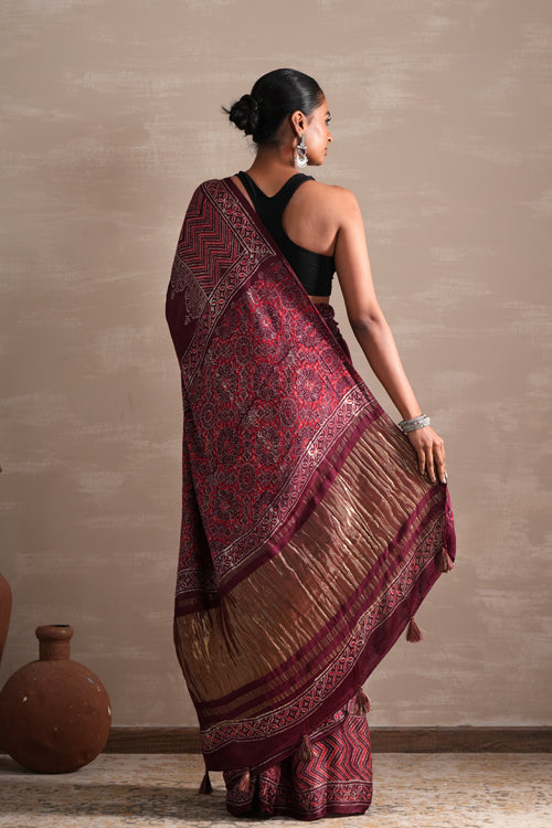 Indulge in the luxurious feel and intricate design of our Vermilion Veil Hand Block Printed Modal Tissue Saree. The naphthol dyes used in its creation give the saree a vibrant and long-lasting color. Each saree is meticulously hand-printed in Bagru, resulting in a unique and stunning maroon saree. Elevate your style and express your individuality with this one-of-a-kind saree.
