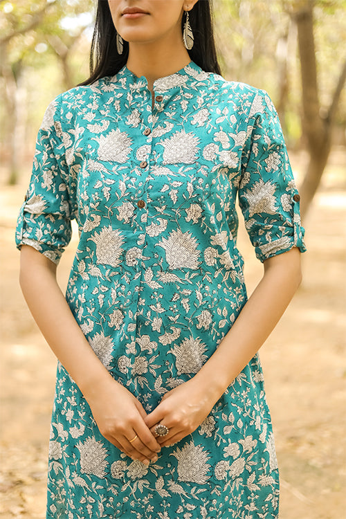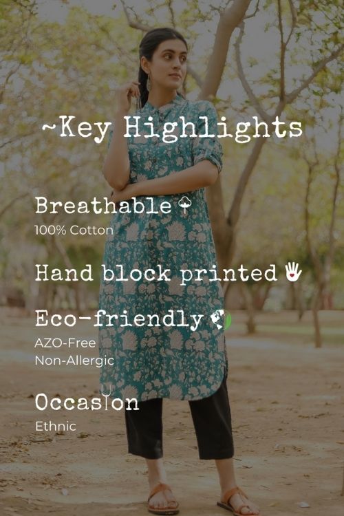 This floral beauty is what you've been missing. Sootisyahi‚ buds and bushes‚ kurti is crafted with the utmost care in pure cotton fabric, ensuring the best comfort. A smart color-blocking for a smart look, enjoy this multi-coloured combination in floral prints. Pick this breathable dress for a full day of comfort while working or relaxing. Pair is with block heels or flats, a sling bag, and set out to have a wonderful day. This piece comes with one pocket for your needs. This dress is stitched from azo free hand block printed fabrics which ensure an confidence and commitment towards the ecological quality of our products.
