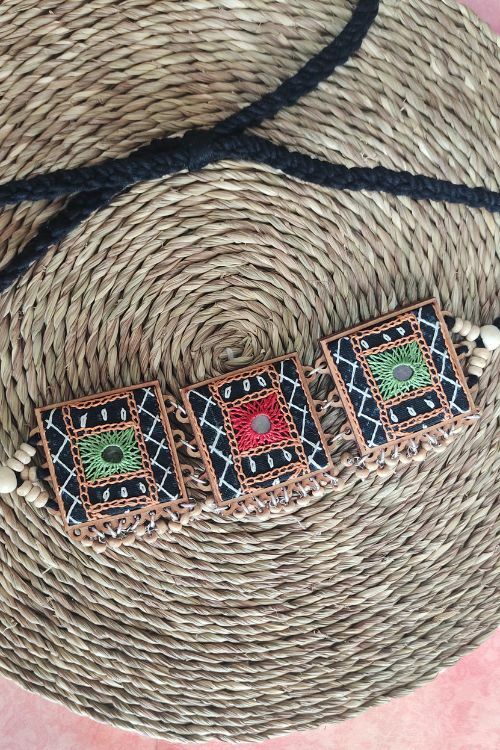 Material - Hand Embroidered Fabric, Beads, Thread, Repurposed Wood Frame