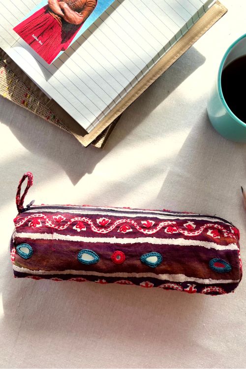 Carry a piece of heritage wherever you go, in the shape and form of the "Finch" Pouch. Slender and cylindrical, it has been crafted from pure cotton. With handblock prints alongwith round and almond-shaped mirrors running along it, this handy pouch boasts of the crafts of India. Patiently hand-embroidered running stitches finish the look. Stationaries, makeup brushes, or your crochet hooks, "Finch" can fit an array of your loved items!