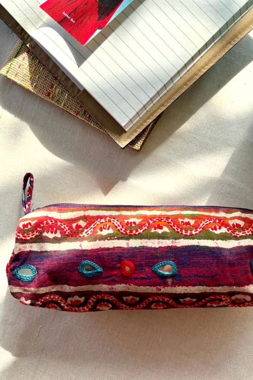 Carry a piece of heritage wherever you go, in the shape and form of the "Magpie" Pouch. Slender and cylindrical, it has been crafted from pure cotton. With handblock prints alongwith round and almond-shaped mirrors running along it, this handy pouch boasts of the crafts of India. Patiently hand-embroidered running stitches finish the look. Stationaries, makeup brushes, or your crochet hooks, "Magpie" can fit an array of your loved items!