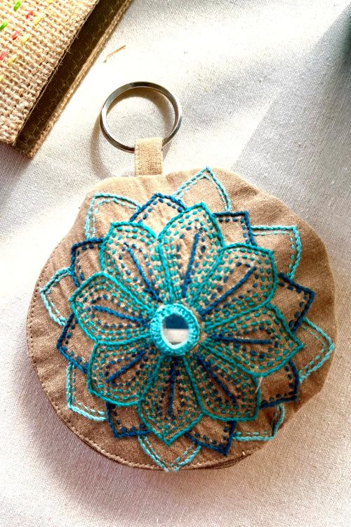 Immensely cute, extremely handy- our "Stellar" pouch guards all your essentials, in style. Handcrafted out of pure cotton fabric, this pouch exhibits a majestic flower, embroidered with stem, running stitch and a single mirror in the centre. A key ring is provided on the side loop so you can attach it to your handbag and never lose it. Safely store your change or airpods in "Stellar."