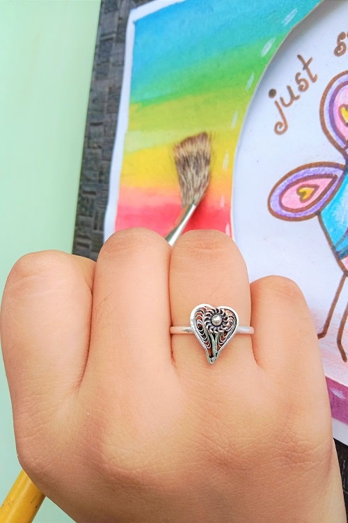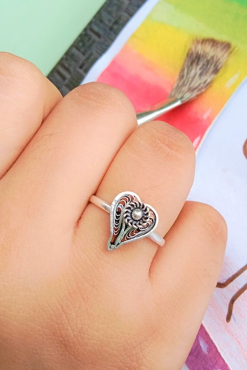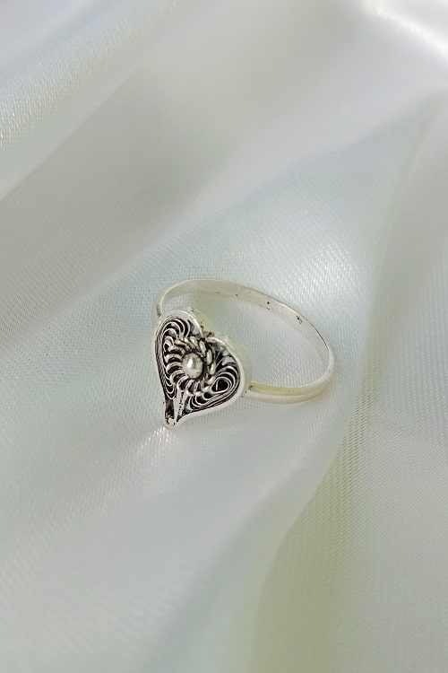 A traditional India design, this simple filigree ring reminds us of the Indian Paan or Betel leaf. This ring adds elegance to any attire and can be used for daily wear. The ring is oxidised to give it an antique silver look. The ring is adjustable and fits any wear. This ring is made of 80% silver in the fine art of Filigree work of Cuttack.
