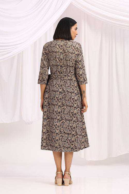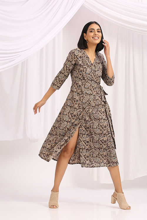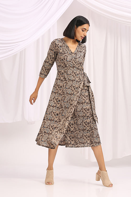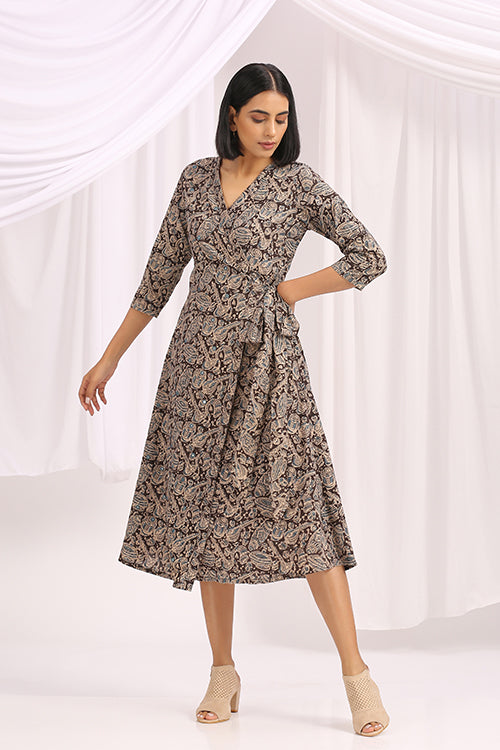 "Shabnam' is from the magical, timeless land of Kalamkari. Black and beautiful, this Hand Block Printed Kalamkari Wrap Dress compliments every body type. It is a style that suits everyone, so if you have any doubts about its sizing or fit, don't. Based on traditional Indian block printing, it brings stylish femininity to daytime dressing. The print is framed with pops of colour and mirrors, and the V-neckline and softly pleated skirt create a flattering silhouette. This dress is ready to be your favourite companion on travels near or far — all you need is the right canvas flats, and statement jewellery. And yes, it comes with 1 pocket!