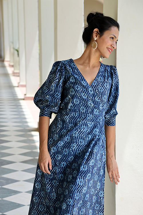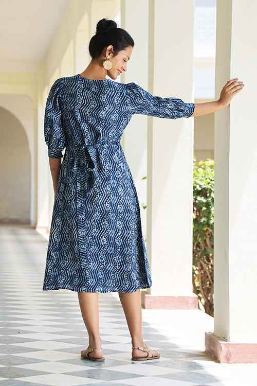 The 'Meanderer' pure cotton dress is a unique piece of clothing. It is hand block printed, which means that no two dresses are alike, and every pleat, pattern and stitch will be unique! This dress also has balloon sleeves as well as a v-neckline to add extra detail and style to this classic piece. It also features 2 pockets at the waist for some added flair. 'Meanderer' is a magical garment that is bound to be an instant classic in your wardrobe collection. Pair it with your favourite heels or sandals for a perfect look you can wear to work or out.