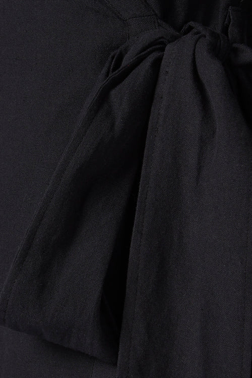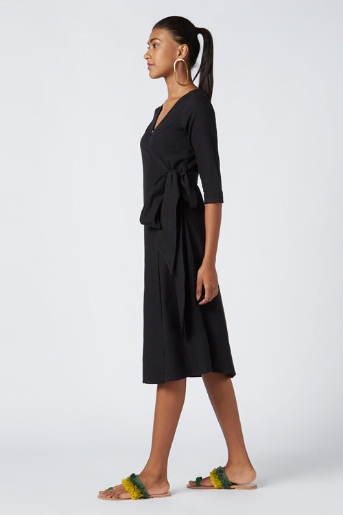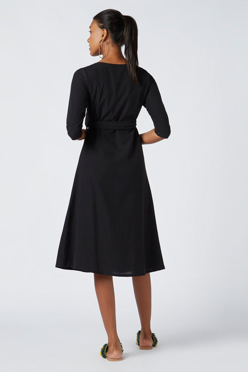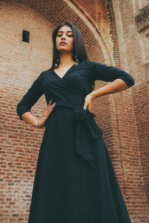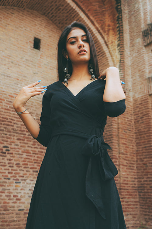 Nothing like a little black dress, that too a wrap one made from airy cotton handloom with a tapering belt to cinch the waist. This beautiful minimalist design is a wardrobe must have for every Okhai woman. The simple sophistication makes it easy to style for whichever occasion you like. It will accentuate your silhouette in a flattering way, all the while keeping you comfortable and chic. Add pops of color or keep it sleek, wear it as a day look, or wear it as an evening look. The choice is yours. We have even snuck in a pocket for your essentials.