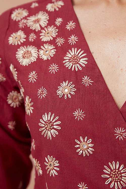 Embrace yourself this season with our elegant 'Glittered Sky' V-neck wrap dress. It is intricately hand embroidered by our artisans at Mithapur, creating small flower motifs with lazy daisy, french knot stitch and mirrors in the centre from the front right side of the yoke and extended up to the left back side through the right sleeve. We've also added a pocket for your essentials. This dress is made to flatter every body and fits like every woman's dream! You shouldn't have second thoughts about this one. Don't forget to tag us on instargam.