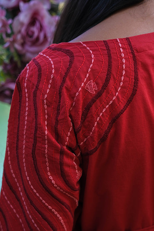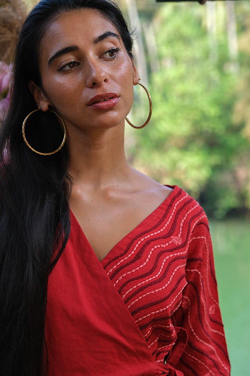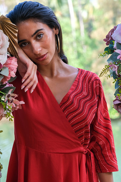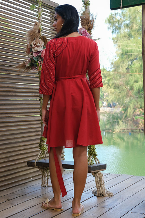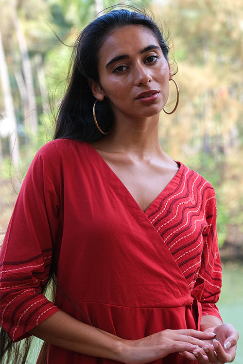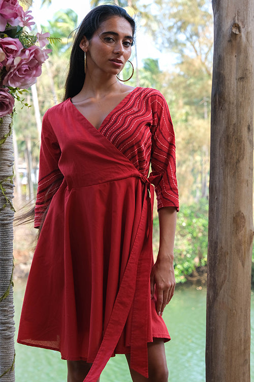 Bring back all the romance to your life with the most effortlessly delightful dress we bring to you in our Valentine Collection! Delicately cut with a deep V-shaped neckline, this wrap dress consists of shoulder loops with press buttons. Lining throughout except sleeves make it the most functional dress, and delicate embroidery with running, stem, lazy daisy satin and chain stitch along the left side of the front yoke extending till the back depicts a serene scene from the ocean. Don't forget to pair the dress with delicate gold accented jewellery for a soft yet stylish look and a pair of kitten heels, you will surely sway your Valentine with your charming dinner date look!