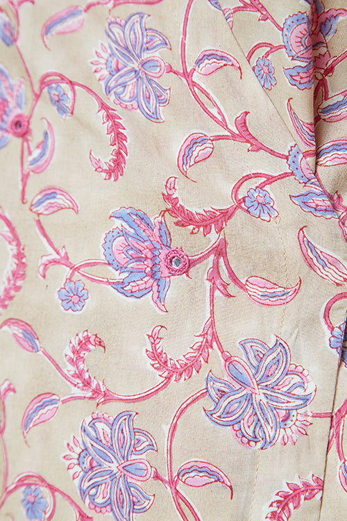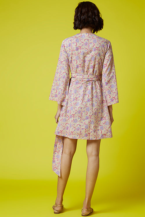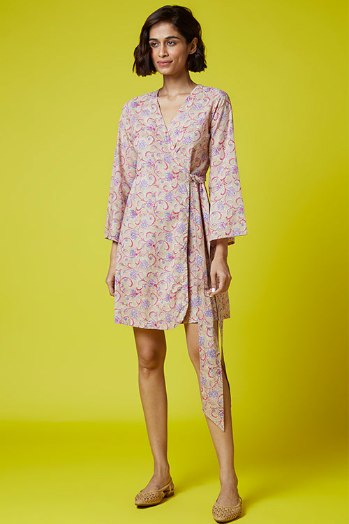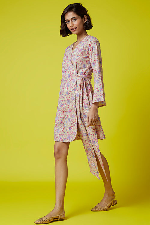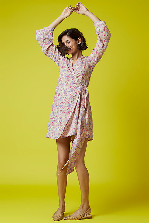 'Tingle' is delicately hand block printed in a combination of soft pastel colours like pink and yellow to get you ready for your princess moment. It is adorned with scattered mirrors in the front panel for added beauty. It also features shoulder look with press buttons and one pocket to provide you with supreme comfort. With a unique design, this short wrap dress is sure to be your go-to outfit. The soft afabric is perfect for breakfast dates, or soirees on the weekends!