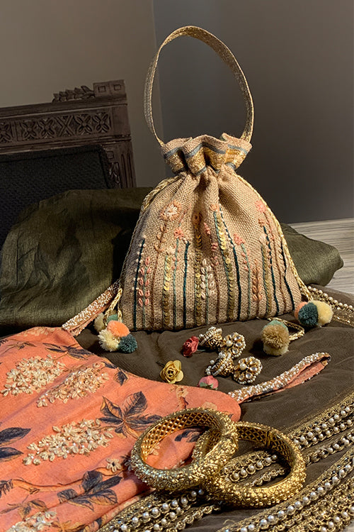 Elevate your style with our charming Beige Country Potli, showcasing countryside-inspired embroidery adorned with matte gold metal sequins. Its earthy tones and rustic motifs make it a versatile addition, seamlessly enhancing various Indian and festive outfits. Crafted with precision, this bag beautifully merges traditional craftsmanship with a touch of countryside allure, making it an ideal accessory for any occasion. Discover rustic elegance and timeless sophistication in every stitch of this handcrafted masterpiece. It is available in 5 colours.
