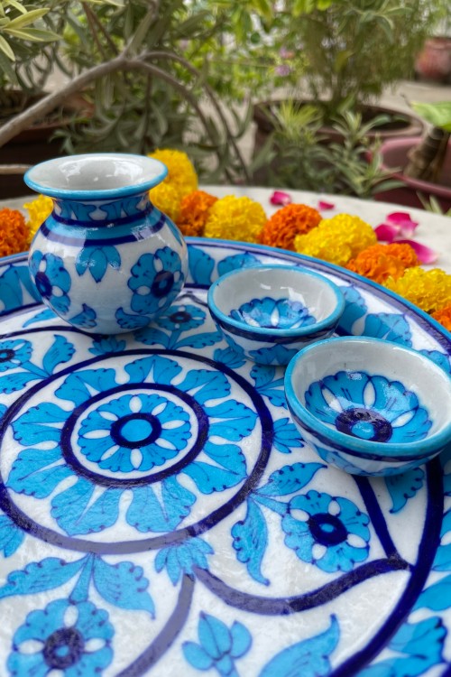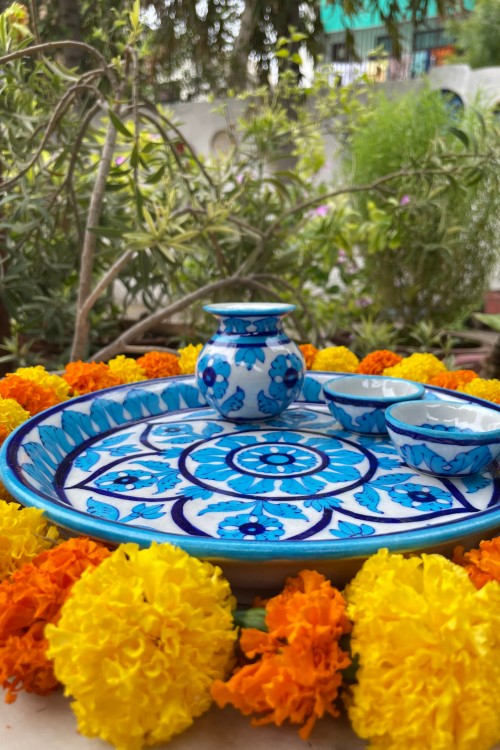 Blue Pottery Is A Traditional Craft Of Turko-Persian Region, It’S Seed Was Planted In Jaipur, Rajasthan (India), In The 19Th Century. Since Then Blue Pottery Has Bloomed And Flourished Exclusively In Jaipur. It Was Registered Under Geographical Indication Handicrafts In 2009 And Is Popularly Known As “Jaipur Blue Pottery”. Quartz Stone And Glass As It’S Main Ingredients, Blue Pottery Uses Low-Fired Glaze, Which Makes It Unique And Markedly Distinct From Other Forms Of Pottery. Each Item Of Blue Pottery Goes Through 42 Manual Processes Over A Period Of 20-25 Days Until The Finished Product Is Ready. Blue Pottery Is Known For It’S Lustre. Unlike Ceramics, It’S Sheen Last For A Minimum Of 800 Years!". Shilp Guru Gopal Saini Is A President Awarded Artist. With Untiring And Sustained Painstaking Efforts Of Whom, The Art Of Blue Pottery Has Gained New Momentum And Has Reached To Unfathomable Heights Of Excellence. Shri Saini Has Been Awarded Numerous Awards. To Name Few; Shilp Guru Award (2016)Ministry Of Textiles, Government Of India; National Award (2009) , Ministry Of Textiles, Government Of India.
