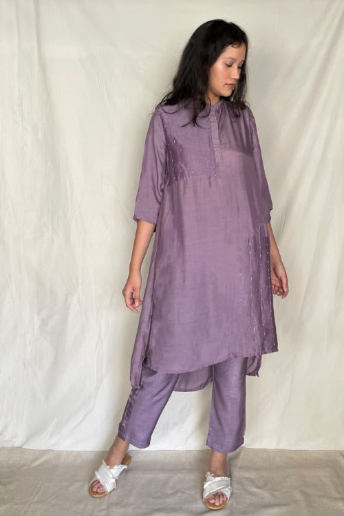 THIS ITEM IS NON - RETURNABLE.DESCRIPTION Being in a state of reverence, is a bliss to be a part of. Wear this as a poetic expression of intimate festivities that you can dress up or down as you please! Top * Stand Collar * Delicate hand beads emboidery *Dual shaded Tunic *Straight fit * Comfort fit. * Length - 42" * Made with Pure Plant based Vegan Silk ABOUT OUR FABRICS Our silks are made from bamboo and wood pulp, dyed using natural pigments. Our breathable and lightweight fabric offers a high sense of ease. Why is it earth friendly? Because the pigments used in the dyeing process are derived from fruits, vegetables, roots, berries and minerals and the fabric has a longer life cycle than traditional silk, which means it is easy on our planet. WHY CHOOSE US .At Chambray & Co. we honour the lives of everyone who has invisibly contributed to what we wear, consciously, at every stage of crafting our products. Shifting fashion to touch the soul instead of just the body, we believe life is interconnected. The process of creation is as precious to us as giving you a beautiful product. We honour flaws in weaving as part of honouring life, streak of shade in dye as true luxury of the handmade. We silently celebrate the fading of natural dyes as we gracefully watch ourselves change through time. We design for mortality while honouring life and nature.
