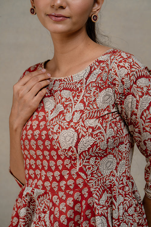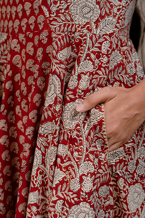 Picture this- you're unwinding on your holiday resort, sipping freshly squeezed juice, and feeling utmost comfort in our pure cotton "Chestnut Charm" Dress. Sounds great, doesn't it? A glorious play of two types of handblocked fabrics, with the Butti print on the right-hand sleeve and running diagonally on the right side back and front; while the majestic flowers printed fabric adorns the left sleeve and is diagonally arranged on the left front and back. Adding that royal charm to the dress, panels of both types of fabrics have been stitched on to create a flowy flare effect. With sophistication galore, triplet buttonhole stitches grace the neckline, the sleeves' edge as well as both pockets. The perfect blend of fashion with functionality, the dress comes with press buttons on the shoulder straps inside and 2 pockets on the sides. Undoubtedly to become an essential classic in your closet, make "Chestnut Charm" yours today and twirl away!