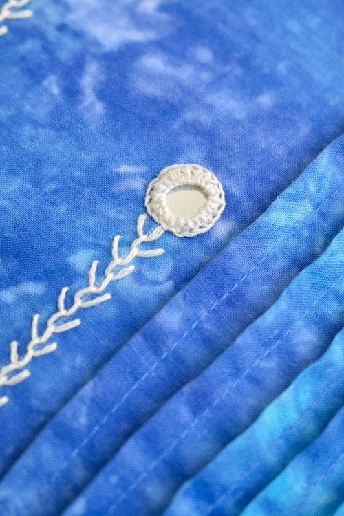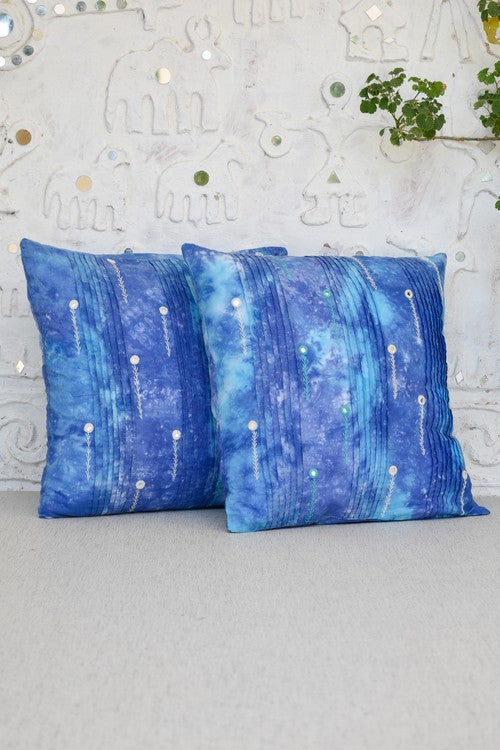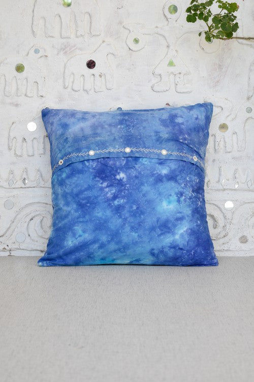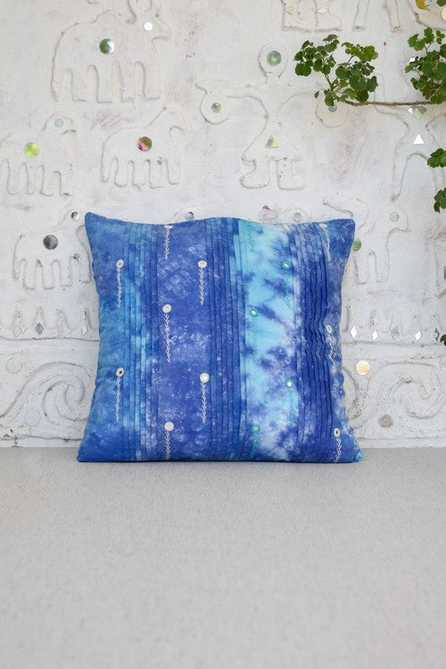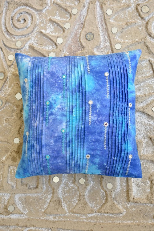 "Mesmerise your guests with the beauty of the shining stars in the sky at your home! 'Nightfall' is one of our most charming cushions covers this season for you to add to your home furnishings wishlist. Handcrafted with love and care, this one is delicately pleated stitched with mirrors and a combination of deep and dark blue hues to create the aura of a night full of stars. That's not all, it is also ornamented with a line of feather stitch at the back to make it look more decorated. This one is made with the traditional technique of tie and dye, a method of dyeing textiles to produce patterns by tying sections of the cloth together, so that they will not absorb the dye. You can pair it with neutral coloured home decor to make the room look elegant yet minimal. "