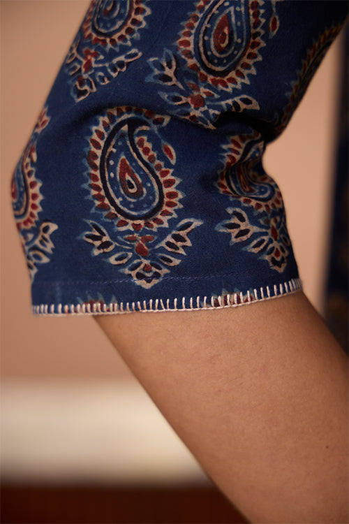 Who said you couldn't do simplicity without style? We bring to you our "Cypress Valley" Kurta Pant Set in all its visual glory. Handcrafted from pure cotton Indigo fabric, it features glorious flower buttas all across the kurta- achieved through the traditional practice of Ajrakh from Kutch and Sindh. Buttonhole stitches adorn the front square neckline, the back neckline, and the edge of the sleeves, elevating the look. You'll find a shoulder strap with press buttons and a fabric potli button with a loop in the front, for closure. Wear with the pants in the set, which is in a contrasting striped Indigo fabric. And worry not as the pants come elasticated and with 2 pockets on the sides. So lounge around, run an errand, or glam it up with a dupatta and golden accessories- this versatile set has got your back for all situations!