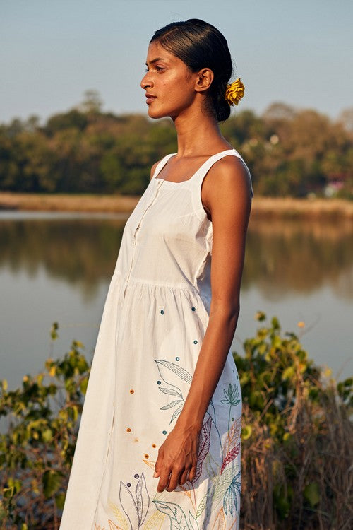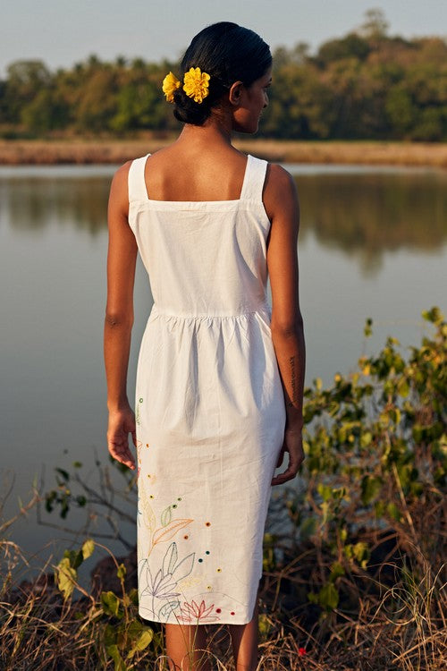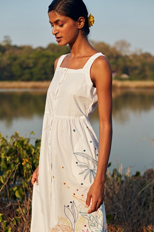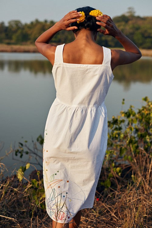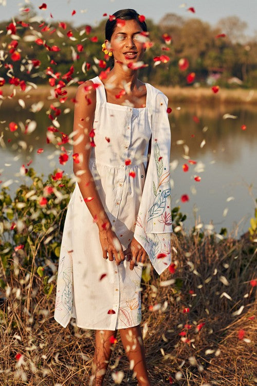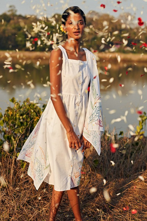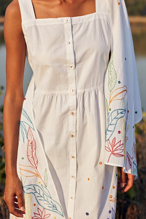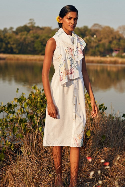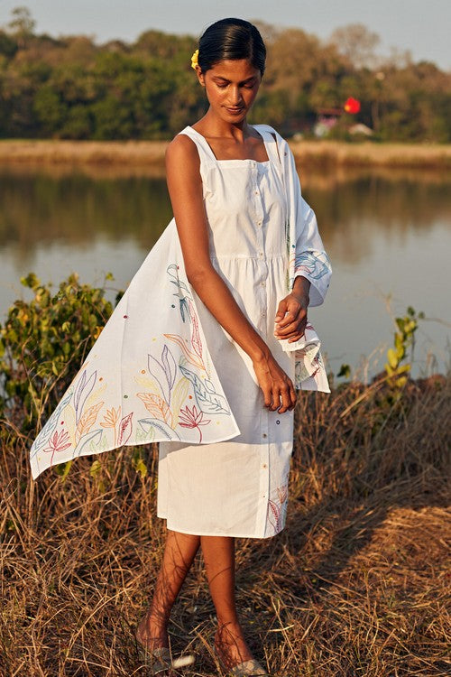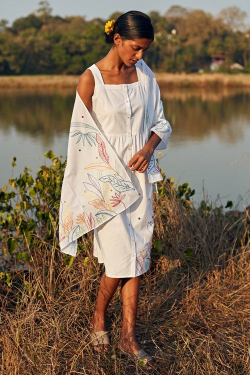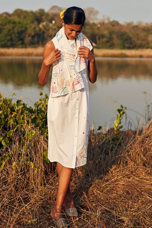 A pleasant white dress to bring in the festival of colours, our ‘Daydream’ ensemble is here for you! Crafted from pure cotton fabric, this sleeveless number is hand embroidered in ethereal florals made using a combination of running, stem and chain stitch. The mirrors travel all over like the scene is straight out of a dream. The accompanying stole also displays the same design as the dress. Wear it as a set for Holi or wear it separately on other casual occasions! We love giving you endless possibilities!