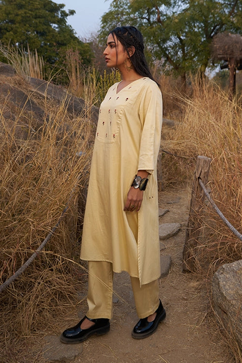 This elegant beige co-ord set in breathable modal cotton features a buti-embroidered yoke, pull-up sleeves, and fine stitch detailing. Paired with comfy, pocketed pants, it’s perfect for effortless everyday style.