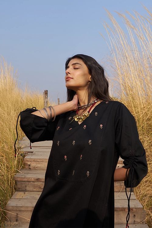 This elegant black co-ord set in breathable modal cotton features a buti-embroidered yoke, pull-up sleeves, and fine stitch detailing. Paired with comfy, pocketed pants, it’s perfect for effortless everyday style.