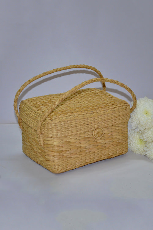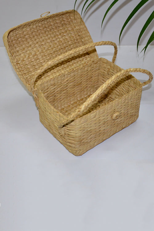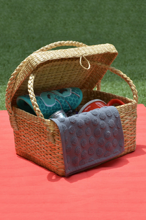 Lunch/Picnic Basket handcrafted from natural Kauna Grass, a water weed found in the wetlands of Manipur. Lightweight, durable and portable these baskets are ideal for carrying lunch, for picnics, beach trips and much more. DHARINI products are handcrafted from eco-friendly and sustainable Natural Fibres. We bring together the incredible skills of artisans and master craftsmen from the remotest corners of the country, who have inherited and perfected their art over generations. Note - Each piece is handcrafted using natural fibres, slight variations may occur in colour, shape and size