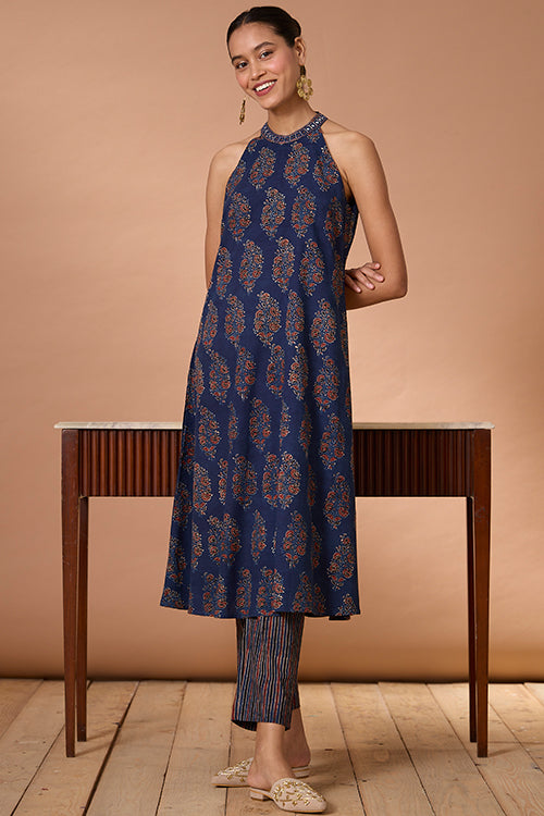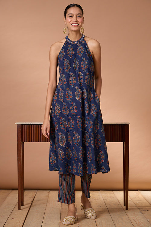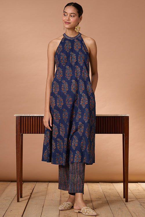 We are here to give you princess treatment by decking you up in our “Evening Lily” Kurta Pant Set. Paying homage to the old traditions of Kutch and Sindh, the dark blue pure cotton canvas boasts exquisite hand-block printed floral motifs. Channel your feminine energy with the flattering haltered neck kurta and a glimpse of your back with Potli buttons for closure. Drawing your eyes to the intricate hand embroidery work, the neckline is embellished with square-shaped mirrors with running and laisy daisy stitches. The pair of pants, in an amusing striped print, come with darts at the front and elasticated at the back. Ditch your purse for you can store your essentials in the 2 pockets of the kurta. With some statement earrings, juttis, and our “Evening Lily” on, you are set to look absolutely ethereal!