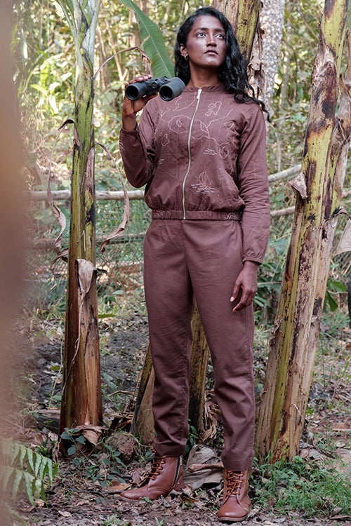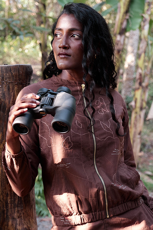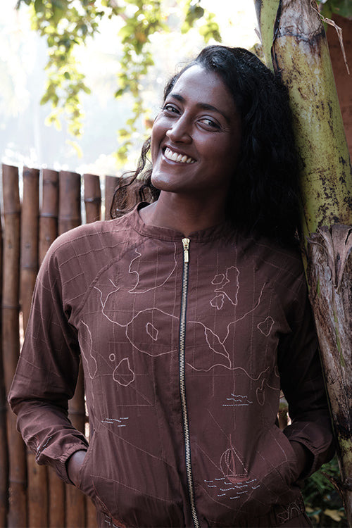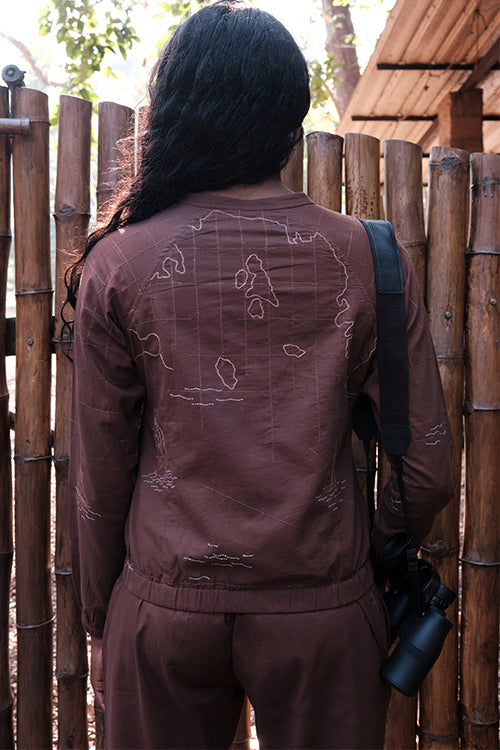 The perfect addition to any adventure-loving woman's wardrobe, get ready to take on the world with the 'Globe' Bomber Jacket! The warm brown colour of the jacket adds a touch of sophistication to the intricate embroidery work, which features a unique combination of stem and running stitch on the front, back, and sleeves. The two pockets on the jacket add functionality and convenience when you're on the go. The 'Globe' Bomber Jacket is designed with comfort and travel in mind. The bomber style is perfect for layering over your favourite travel outfit, while the lightweight fabric ensures that you stay comfortable throughout your journey. The intricate embroidery work is a nod to the beauty of the world around us, making this jacket perfect for women who love to explore and go on solo trips. To style this jacket, pair it with your favourite jeans and a comfortable t-shirt. The jacket adds a touch of sophistication to any outfit and is perfect for layering over your favourite travel outfit. Complete the look with a pair of comfortable sneakers or hiking boots, and you're ready to take on any adventure. Globe is a must-have for any woman who loves adventure, exploring, and going on solo trips. It makes the perfect travel companion, while the warm brown color adds a touch of sophistication to any outfit.