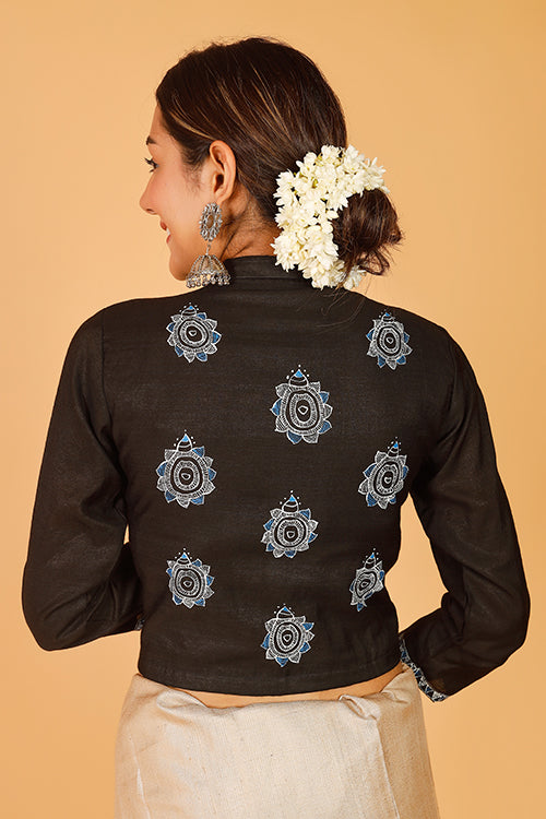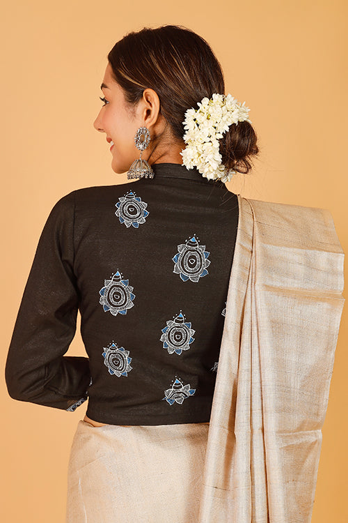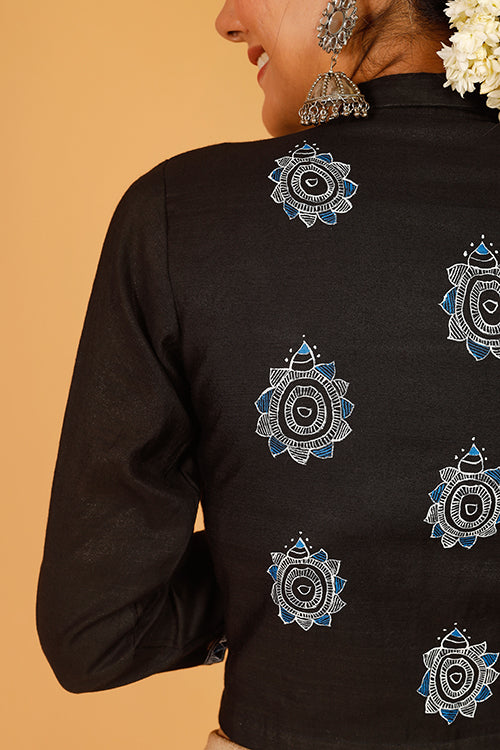 Gubbaro handpainted blouse is crafted with the utmost care in pure handwoven cotton fabric, ensuring comfort. The front pocket of the blouse depicts the Madhubani turtle "Kurmaraja", a form of the Divine, whereas, the collar, & the sleeves' hems have highlighted Madhubani border. This three-fourth sleeved blouse features a collar neck cut & is tailored with a front opening. You can pair it with a number of colorful sarees which makes it a must have in your wardrobe. The hand painted product proudly reflects traditional Indian Madhubani art, made exclusively on order by an authentic team of nationally renowned artists, no returns.