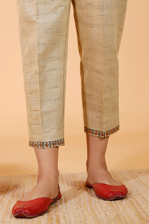 Authentic Handpainted Madhubani Pant in Handloom Cotton Fabric. We have decorated this elegant pant with motifs inspired heavily from the beauty of nature. Crafted in a straight silhouette, & woven in fine handloom fabric. Features an elasticized waist on the back, a side pocket & a side slit on the bottom hem. Handloom cotton fabric is comfortable all year round, essentially keeping one cool throughout the summers, & cozy in the winters. The hand painted product proudly reflects traditional Indian Madhubani art, made exclusively on order by an authentic team of nationally renowned artists, no returns.