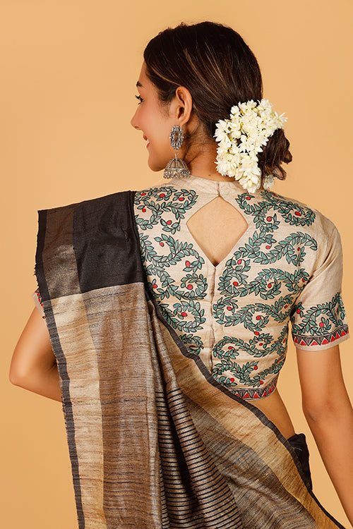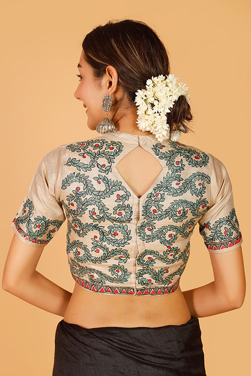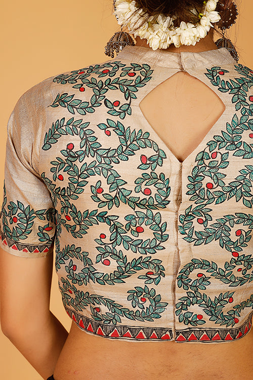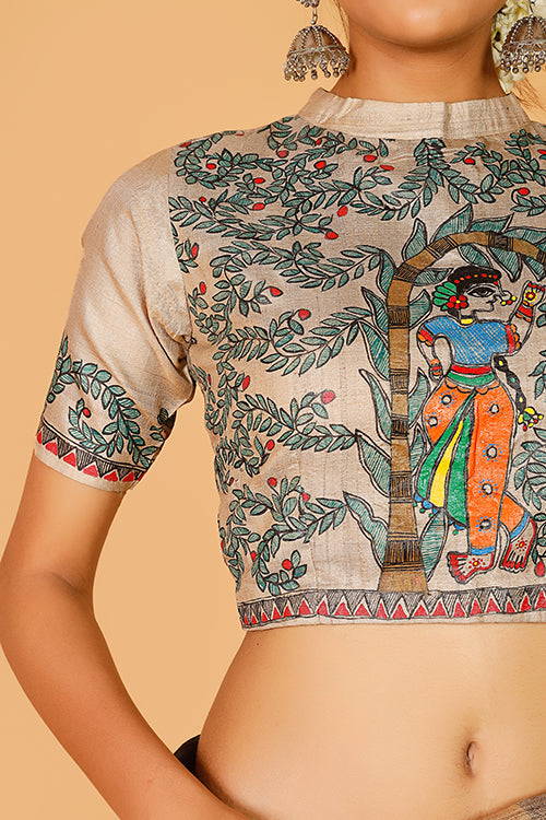Gubbaro handpainted blouse is crafted with the utmost care in pure handwoven tussar silk fabric, ensuring comfort. On the front, Radha rani is depicted in a forest, whereas the back showcases Madhubani leaves. This half sleeved blouse features a round neck cut & is tailored with a back opening. You can pair it with a number of colorful sarees which makes it a must have in your wardrobe. The hand painted product proudly reflects traditional Indian Madhubani art, made exclusively on order by an authentic team of nationally renowned artists, no returns.