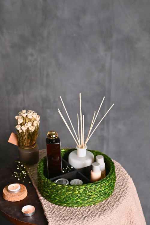 Food safe , Non Plastic containers for serving Roti / Papadums / idlis helps your family & the environment both. UNIQUE HOME & KITCHEN DÉCOR PIECE which brings an organic element into your homes & kitchens. Sabaii Grass, an indigenous locally available perennial Jungle grass, is hand cut, sundried, & plaited & One Roti Box takes 3-4 days from start to finish with min 3 ladies involved in various processes. The grass is cut, sun-bleached and then dried in the sun for 2 to 3 hours. The grass is then dyed with the desired organic dyes by boiling, fuel used is waste grass as well as cow dung, making the process 100% organic way. It is then rinsed in cold water & dried again to prepare it for making plaits/ropes . Following this 5-hour procedure, grass plait is hand-stitched one row at a time into one Roti Box, which takes two days or approximately 12 hours to have 1 pc ready. In the meantime in another village nearby the roti box lid is made & it is assembled in KADAM HAAT office. The jigs / SOP’s for processes are all given to everyone involved during the 3 year training done in the clusters by the NGO KADAM. The number of steps involved demonstrates the dedication of the artists. The use of certified organic colors that are devoid of chemical effects has been ensured after a lot of research done by the NGO. A "must-have" for every modern CONSCIOUS CONSUMER.
